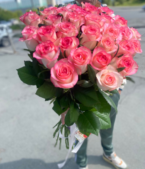 Покупал розы без доставки, забирал с магазина. Как и просил ко времени было готово, розы хорошие, красивые!