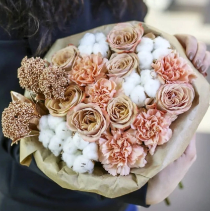 Букет из диантусов и роз с добавлением хлопка "Кофейная фантазия"