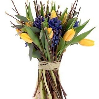 Букет из тюльпанов и гиацинтов с добавлением декоративных веточек